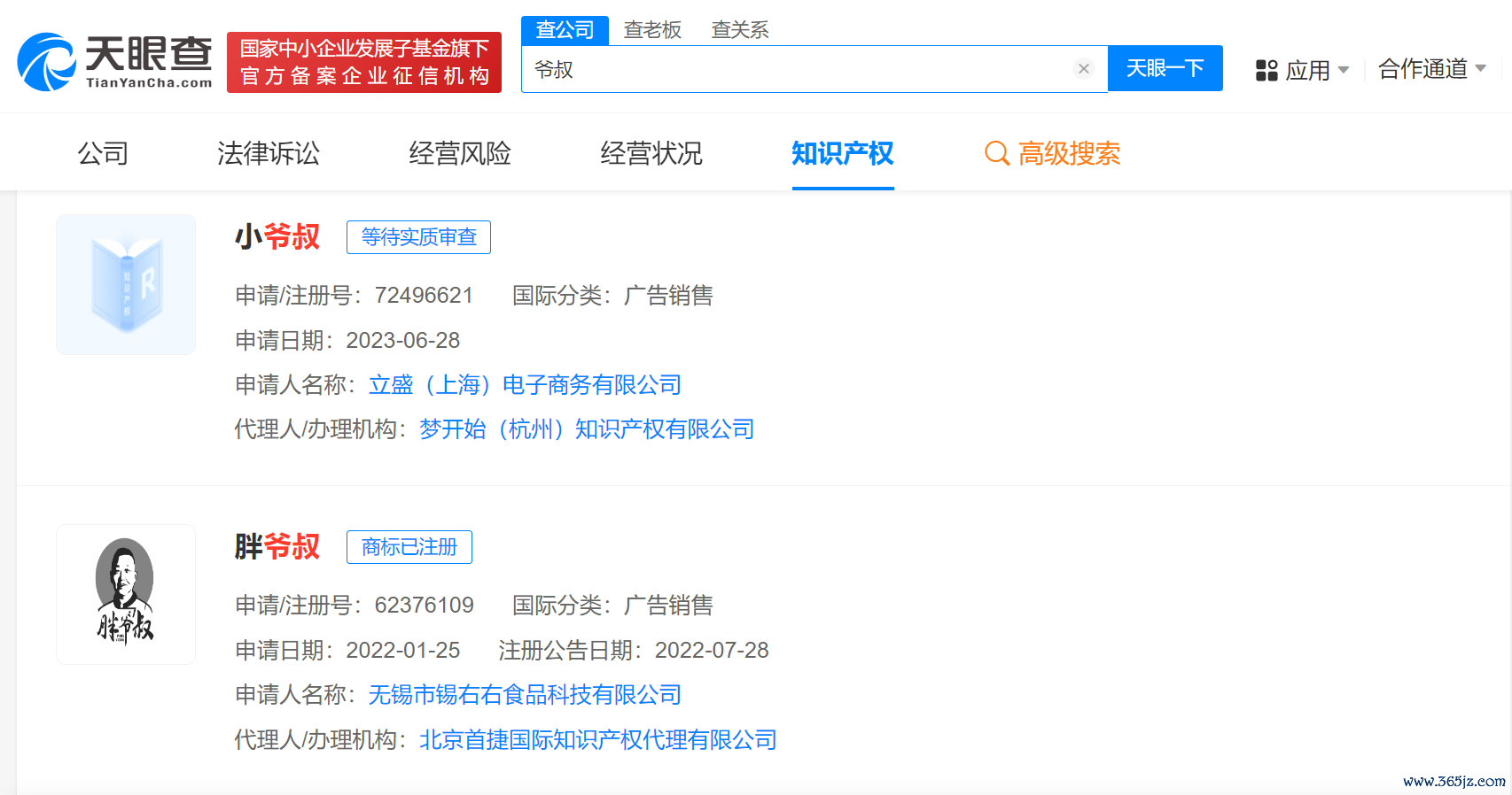 天眼查App贯通,2012年、2017年“爷叔”已被央求注册为商标,央求东谈主分裂为上海某食物公司、上海某商贸公司,国外分类为便捷食物、酒,两商标分裂于2014年、2018年得胜注册。此外,“小爷叔”“胖爷叔”“沪上爷叔”等也已被央求注册商标,国外分类波及服装鞋帽、告白销售等,部分商标已完成注册。