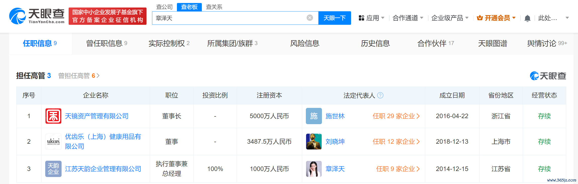 天眼查App显现,章泽天计划的9家企业中8家为存续情景,包括江苏天韵企业处置有限公司、天镜钞票处置有限公司等。其中,章泽天抓有宿迁天强股权投资合资企业(有限合资)、宿迁天空企业处置合资企业(有限合资)等6家企业股份,并在天镜钞票处置有限公司、江苏天韵企业处置有限公司等3家企业担任高管职务,其河山波及企业处置、股权投资、基金处置等鸿沟。值得一提的是,海南三亚天博产业私募基金处置有限公司、北京天强坤泰投资处置有限公司、宿迁天强股权投资合资企业(有限合资)3家企业为章泽天与刘强东共同抓股。